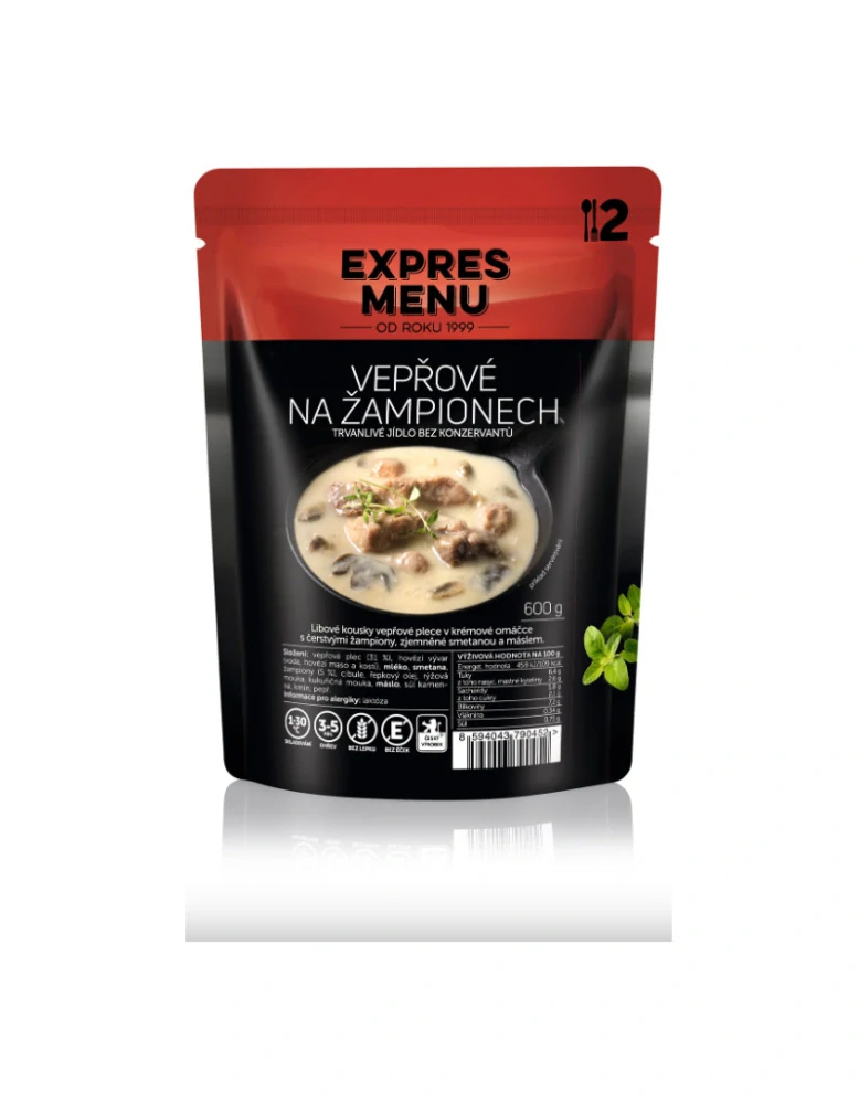 Složení: vepřová plec (31 %), hovězí vývar (voda, hovězí maso a kosti), mléko, smetana, žampiony (5 %), cibule, řepkový olej, rýžová mouka, kukuřičná mouka, máslo, sůl kamenná, kmín, pepř.